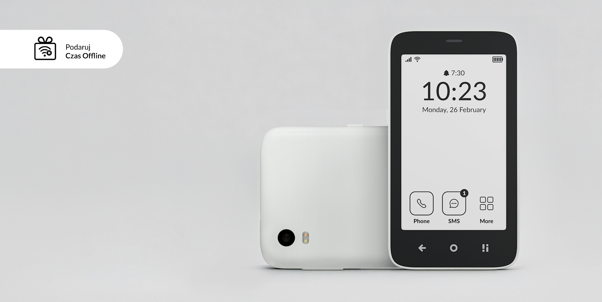 Poznaj Mudita Kompakt - minimalistyczny telefon z ekranem E Ink®, stworzony, by przywrócić równowagę w świecie pełnym rozproszeń.
